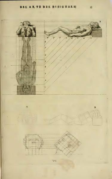 The text, in Italian, translates to 'On the Art of Drawing.' The page includes diagrams showcasing techniques for drawing proportions of the human body using grid methods. It serves as an instructional guide for artists in achieving accurate representations of human figures in different positions.