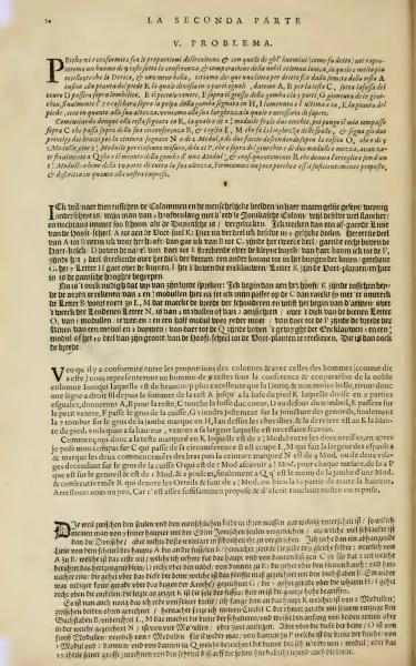 Beginning with the line marked nK, which is the second ratio between two heights, one places a compass at C that passes over the circumference of the chest at (E) and through (B), cutting through (I, M), which determines the width of the shoulders. I make the width of the shoulders, 0.6 a measure from the breast, shown (N) & with the Mod. from Modavalica, 2 Modules per size, from P, which is above the knee by two and a half modules, and ending at Q, which is minute of the leg appointed by the Module Khan. Finally, R, which denotes the complete height, Ending our proposal and description with what is directed as our enterprise.