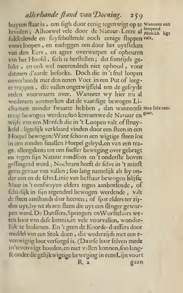 It is a natural state for someone to try to balance themselves; although many stumble and stagger due to the teachings of nature but still continue to take a few steps forward, trying to correct themselves by extending their arms or by jerking the head backward or forward. Sometimes they succeed, but mostly not, until they meet the ground. However, those who unexpectedly step into a hole or an opening while running fast, undoubtedly fall forward for the mentioned reason. When we observe that agile bodies seem to weigh less when moving than when they are still, we can easily understand the nature of a person falling or tripping while running by comparing it to a stone moving in a hoop. Even though a heavy stone set loosely inside a small round hoop and twirled over slowly at first, then rapidly more and more swings according to its nature around and upside-down without falling out, because it stays along the same line of motion. But if it sways elsewhere, approaching an obstacle or being quickly thrown off balance, the stone immediately falls out or flings outward, almost like a stone being thrown from a sling. Dancers, jumpers, and acrobats make excellent use of this knowledge in many situations. What the tightrope walkers do with the aid of a balancing pole, they keep their balance and do not fall as long as they maintain movement along the even line.