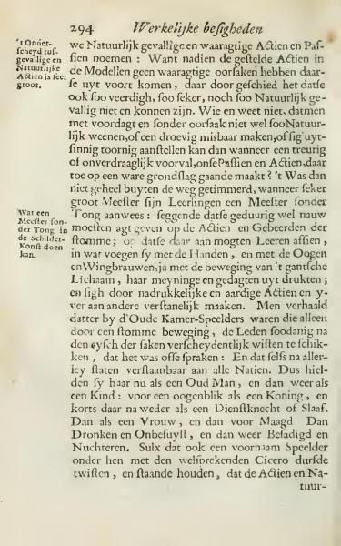 We call truly graceful and genuine Actions and Passions: Since the set Actions in the Models do not have genuine causes from which they arise, it happens that they cannot be equally skillful, as certain, nor as naturally graceful. Is it not known that one cannot naturally weep without reason, or make a sorrowful lament, or behave wildly angry, unless a sad or intolerable event, our Passions and Actions, fundamentally compels it? It was not entirely inappropriate when a certain great Master taught his students and Master without Tongue: saying that they must always pay close attention to the Actions and Gestures of the mute; so they could learn from them, in what manner they could express their opinions and thoughts with their Hands, Eyes, and Eyebrows, indeed with the movement of their entire Body; and make themselves understood by others through emphatic and pleasing Actions and Zeal. It is said that among the Old Theater Players, there were those who, through a mute gesture, arranged their Limbs in such diverse ways as required by the matters, that it was as if they spoke: And that this was understandable to all Nations regardless of differences. Thus they presented themselves now as an Old Man, and then again as a Child; for a moment as a King, and shortly thereafter again as a Servant or Slave. Then as a Woman, and then as a Maiden. Then Drunk and Reckless, and then again Sensible and Sober. So much so that a prominent Player among them dared to challenge the eloquent Cicero, maintaining that the Actions and Nature-