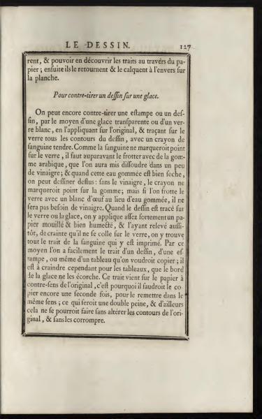 One can also transfer a print or a drawing by using a transparent glass or white glass, applying it over the original, and tracing all the outlines of the drawing with a soft sanguine pencil. As sanguine would not mark on the glass, it must first be rubbed with gum arabic, dissolved in a little vinegar; and when this gum water is dry, one can draw on it: without the vinegar, the pencil would not mark on the gum; but if the glass is rubbed with an egg white instead of gum water, vinegar is not needed. When the drawing is traced on the glass or mirror, a damp and well-moistened paper is applied strongly to it, and quickly removed, lest it should stick to the glass, whereupon one finds all the lines of the sanguine transferred. By this method, one can easily obtain the outline of a drawing, a print, or even a painting one wishes to copy; however, it is feared with paintings, that the edge of the glass might scratch them. This imprint appears on paper in reverse of the original, for which reason it needs to be copied again, to restore it to the same direction; which would be a double workload, and besides, it cannot be done without altering the contours of the original, and corrupting them.