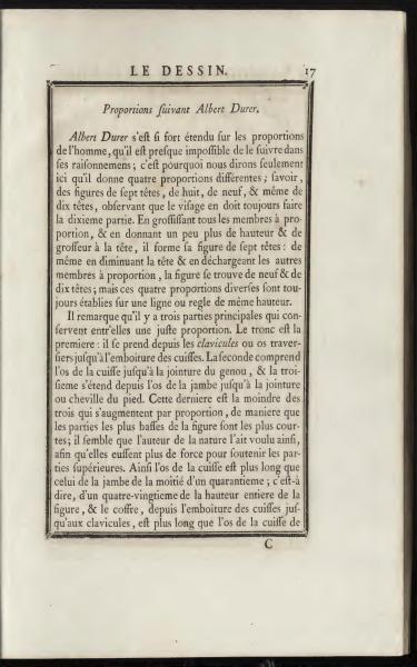 Albert Durer has discussed human proportions so extensively that it is almost impossible to follow his reasoning thoroughly. Therefore, we will only briefly note here that he defines four different proportions: figures of seven heads, eight, nine, and even ten heads, noting that the face should always occupy the tenth part. By enlarging all limbs proportionally and giving a bit more height and size to the head, he forms his figure of seven heads. Similarly, by reducing the head and proportionally lightening the other limbs, the figure can be nine or ten heads tall; however, these four different proportions are always based on a line or rule of the same height.