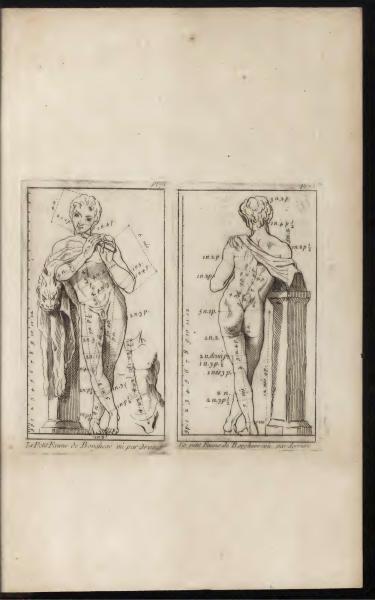 The text describes two views of the "Small Faun of Borghese," one from the front and the other from behind. These images are likely used for teaching purposes in the context of anatomy and artistic proportions.