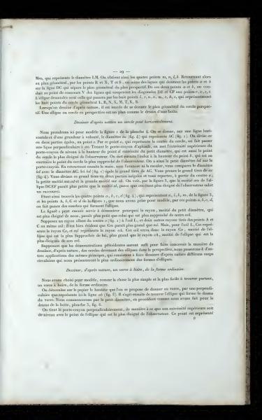 The text describes the geometric method for drawing a circle in perspective, particularly focusing on the ellipse that results from observing the circle at an angle. Initially, by understanding the geometric relationships and using points of reference on a plane, the artist can translate the true form of a circle into its perceived form as an ellipse. The text further details practical steps using a model from a specified plate, guiding the artist in accurately positioning and aligning a circle on a horizontal plane.