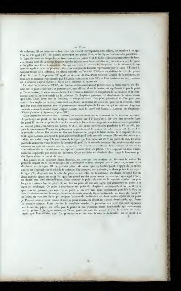 Once the base of the column ETYX, etc. (same design exactly as a box), is found, draw on the upper plan, in perspective, an ellipse, with its center represented here by point p. From this center, draw a vertical. Find the height of the column's capital by comparing it to the total height of the column. This capital presents exactly the same design as that of a box seen from below, composed of a geometric plan and a perspective plan. The corners of this capital are vertically aligned above those of the column's base, which can be confirmed using a vertically held compass. The curve that finishes this capital still features half an ellipse inscribed in the square that forms the bottom of the capital. (See plate 4, figure 2, the PR plan.)