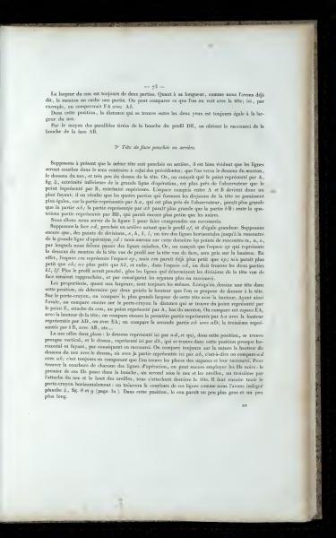 The proportions and marks are always the same. When drawing a head in this position, you determine the height you intend to give the head by two points. On the drawing tool, compare the greatest width of this head with the height. Having thus the point A, set on the cd, or the point represented by A, bottom of the chin. Compare this space EA with the height of the head; also compare the first part represented by Aa with the height represented by A B, or also EA; compare the second part ab with abD; the third part represented by b B, with AB, etc...