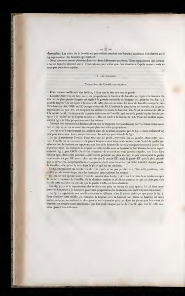 When viewed from the front, the proportions of the ear are as follows: the height of the ear is equal to the height of the nose, and its widest part equals the greater half of its height. Here, plate 30, fig. 1, the maximum width CD is equal to half of AB, plus one sixth. The ear hole occupies one third of the height; here, GHK or LD occupies one third of AB. The most narrow part of the ear, shown here as AN, is always at one sixth of the total height: here, N is at one sixth of AB or at half of AL. The width of the lower part of the ear, which is its narrowest point, is equal to half the total width: here, MA is equal to half of EA. For the ears shown in fig. 3 and 7, the proportions are the same.
