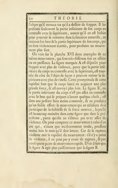 From plate XVI, we see two examples of the same movement, which are very different, whether in action or in potential. Figure A is positioned to strike with more force, because the lower part of the body, in contrast to the upper part, is turned towards the object so that the upper part can be pulled back with more speed. This swiftness and rapidity give the launched body more force, and it is sent further away. Figure B, where the lower part of the body is not sufficiently contrasted with the arm that prepares to throw something, is in a much less convenient position and will produce only a weak effort: the resulting movement must share the weakness of its driving force, which is much less in this figure than in the previous one, because it does not launch with enough violence. We can compare this movement to that of a bow which, being only moderately tense, will shoot the arrow less far than it should launch. For from violent rupture arises the speed of movement: if there is no violence, there can be no rupture, and consequently no rapid movement. Thus, it follows that Figure A acts more powerfully than Figure B.