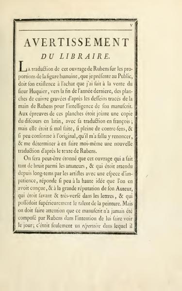 The translation of this work by Rubens on the proportions of the human figure, which I present to the Public, owes its existence to the purchase I made at Mr. Huquier's sale towards the end of last year, of the copper plates engraved according to the designs traced by Rubens' own hand for the comprehension of his manuscript. Attached to these plates was a copy of the discourse in Latin, with its translation into French; but it was so poorly done, full of inaccuracies, and so inconsistent with the original that I had to abandon it and resolve to make a new translation myself based on Rubens' text.