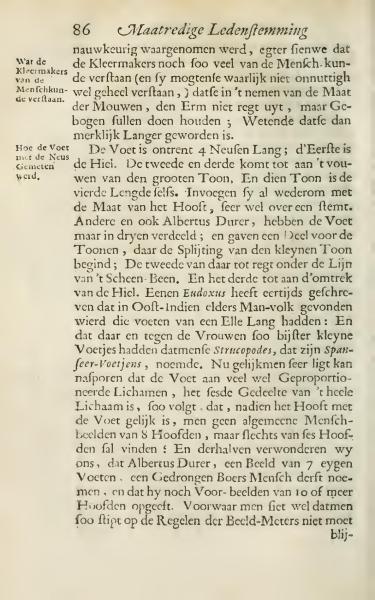 Historically, Eudoxus wrote that in certain parts of East India, there were men whose feet measured an ell-long, and that women there had unusually small feet that were called "Strucopodes" or "tight-fettered-footings." It can very easily be examined that in well-proportioned bodies, the foot is the sixth part of the whole body, which follows, then, that since the head is similar to the foot, one will not find general human figures of eight heads, but only of six heads. Therefore, we are surprised that Albrecht Dürer called a statue using seven own feet a sturdy peasant man, and that he also presented models of ten or more heads.