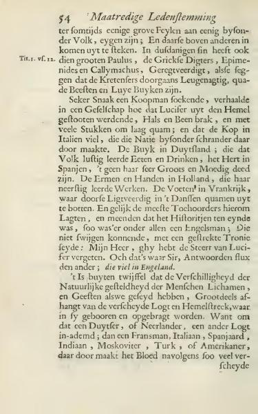 Maatredige Ledenstemming is translated as 'Moderate Popularity of Limbs' referring to the distribution of qualities attributed to different nations based on a comical tale about Lucifer's fall and the resulting differences in human characteristics.
