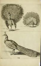 The page is from a historic book and contains the Roman numeral 'XCIX,' meaning 99. The image shows detailed engravings of peacocks with their tails fanned out, illustrating the text's discussion of drawing techniques. This complements the book's teaching on depicting parts of the body and nature. |